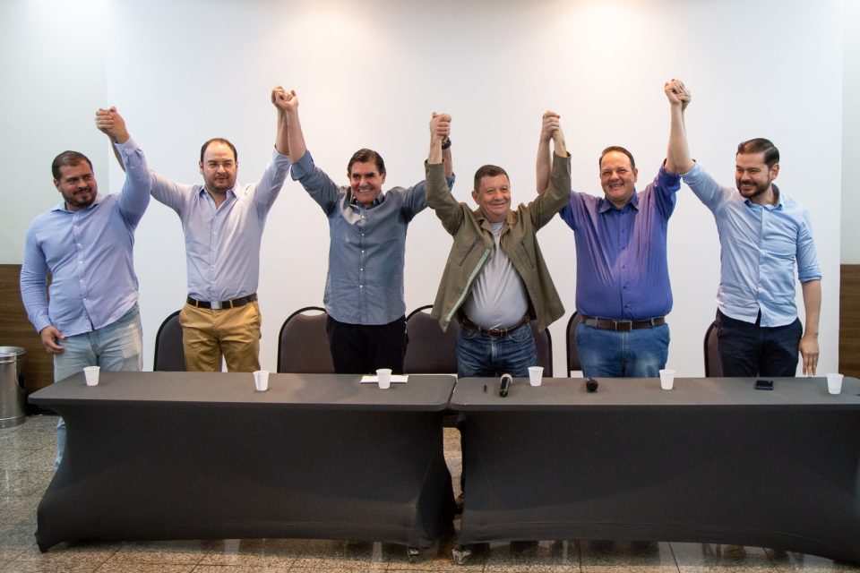 Na mesa da coletiva estavam André Trindade, Alessandro Hirata (PSDB), Duarte Nogueira (PSDB), Coronel Usai (PODEMOS), Rafael Gabarra (PODEMOS) e Elvio Pinotti (PODEMOS).