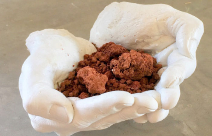 Retratos de famílias numerosas e trabalhando em ofícios diversos integram a instalação de Helen Faganello. Dentro do contexto do ato de imigrar, em busca da “nova vida”, a artista ainda apresenta pinturas e esculturas com cenas de vidas e mãos feitas de gesso de mulheres, homens e crianças, algumas delas seguram punhados de terra.