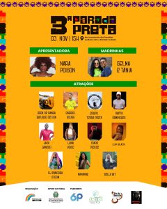 A programação, que terá como apresentadora a drag queen, Naira Poison e Selma e Tânia, como madrinhas da atração desta edição. São vinte apresentações artísticas, incluindo o show da Roda de Samba Batuque de Rua. “Vamos celebrar o orgulho da comunidade preta LGBTQIAPN+ e abordar demandas da comunidade negra, oferecendo educação sobre HIV/AIDS, além de informações sobre sexualidade, gênero, saúde, violência e moradia. A Parada Preta surge da urgência de continuar a luta por direitos para pessoas pretas e LGBTQIAPN+, promovendo espaços de reflexão por meio da arte.