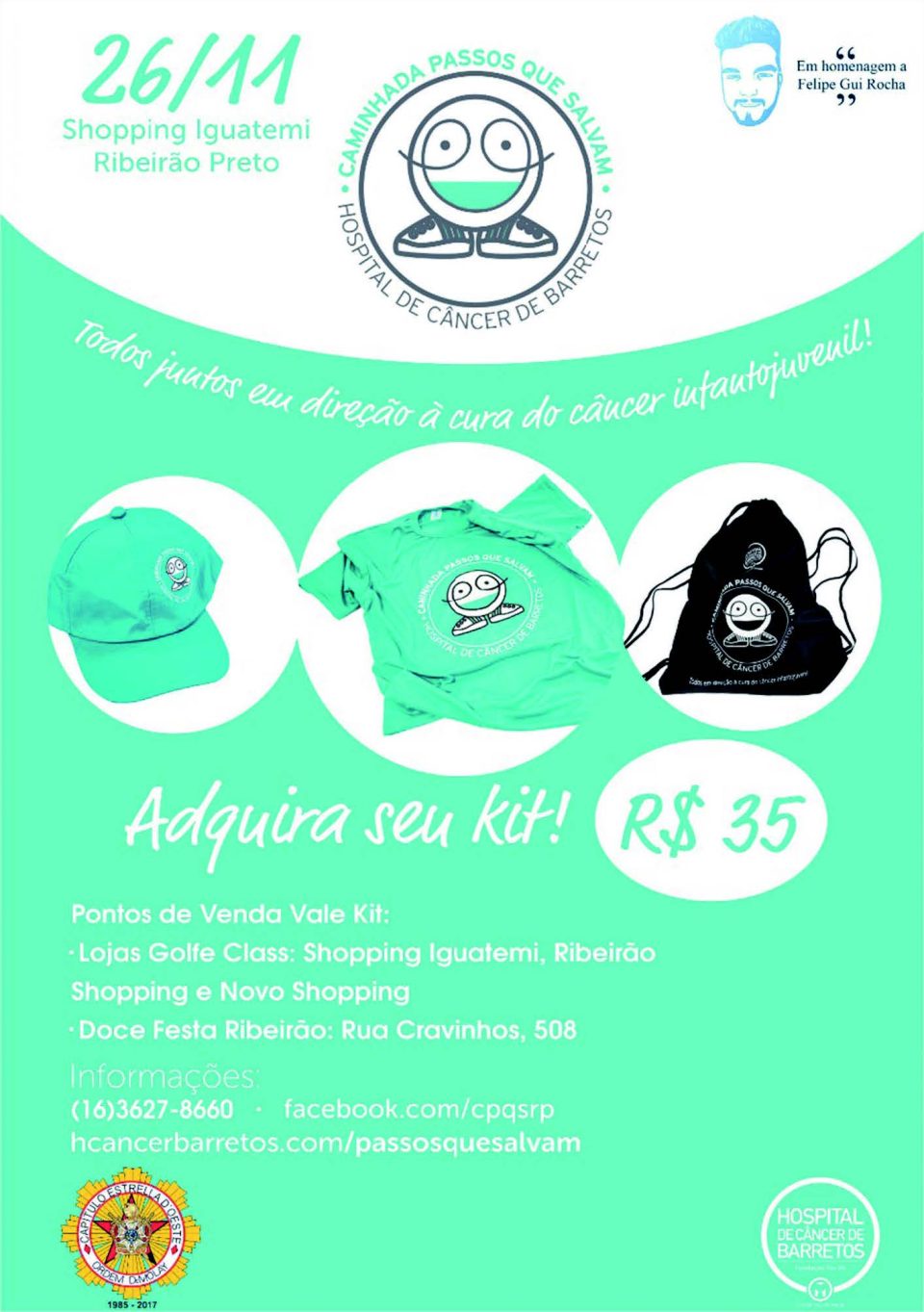 O kit da Caminhada “Passos que Salvam” (Camiseta + Boné + Mochila por R$ 35,00), pode ser adquirido nas Lojas Golfe Class nos Shoppings de Ribeirão ou na Doce Festa Ribeirão (Rua Cravinhos, 508). Todo o valor da venda será destinado ao Hospital do Câncer de Barretos. Mais informações pelo telefone (16) 3441-8681 ou no site: https://www.hcancerbarretos.com.br/passosquesalvam/cidades-participantes/