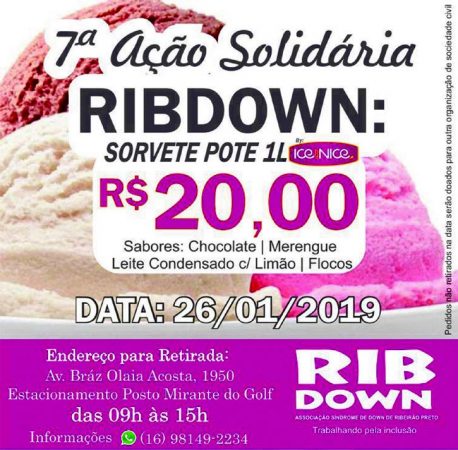 A Associação Síndrome de Down de Ribeirão Preto – RibDown realiza sua 7ª Ação Solidária no dia 26 de janeiro (sábado). Na ocasião serão vendidos potes de sorvete Ice By Nice (1 litro) por R$ 20, nos sabores: chocolate, merengue, leite condensado com limão e flocos. A ação acontece na avenida Bráz Olaia Acosta, 1950, das 9h às 15h. Mais informações pelo telefone (16) 98149-2234.