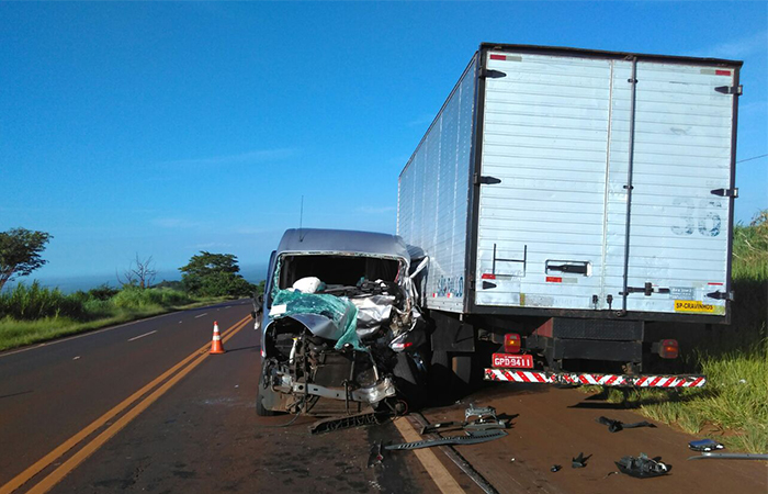 O acidente envolvendo um microônibus de transporte alternativo de passageiros e três caminhões. Não há informações da quantidade de passageiro transportado pelo microônibus.