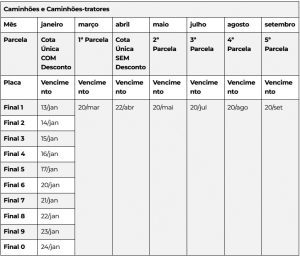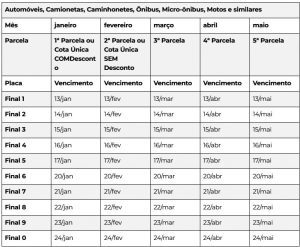 Os proprietários poderão escolher entre as seguintes formas de pagamento com vencimentos de acordo com o final de placa do veículo: