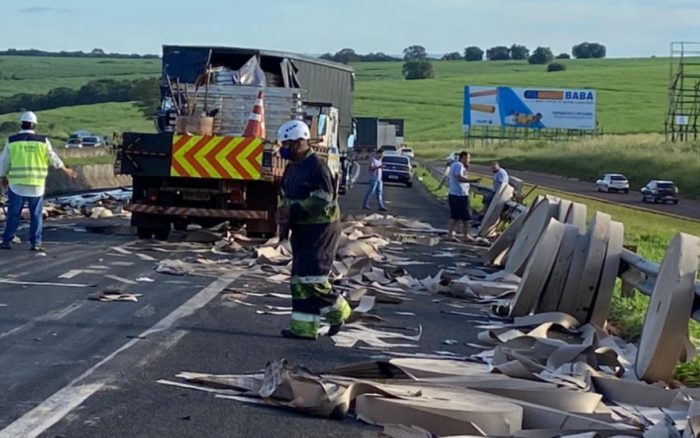 Diante do acidente, a pista foi totalmente interditada e o tráfego desviado para a alça de acesso no km 301. O local permanece com desvio enquanto é realizada a limpeza da pista, devido ao derramamento de carga (bobinas de papel).