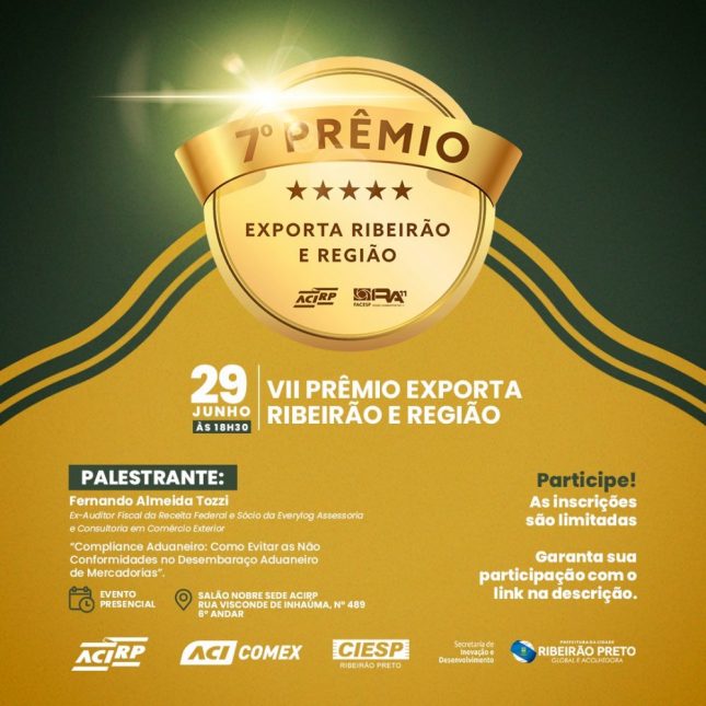 A Associação Comercial e Industrial de Ribeirão Preto (Acirp) premia nesta quinta-feira (29) empresas que são destaque em 2023 no segmento de Comércio Exterior. Os ingressos para o 7º Prêmio Exporta Ribeirão e Região são gratuitos e já estão disponíveis, mas as vagas são limitadas.