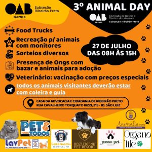 O 3º Animal Day será realizado no próximo sábado, dia 27 de julho, das 08h às 15h, na Casa da Advocacia e Cidadania de Ribeirão Preto.