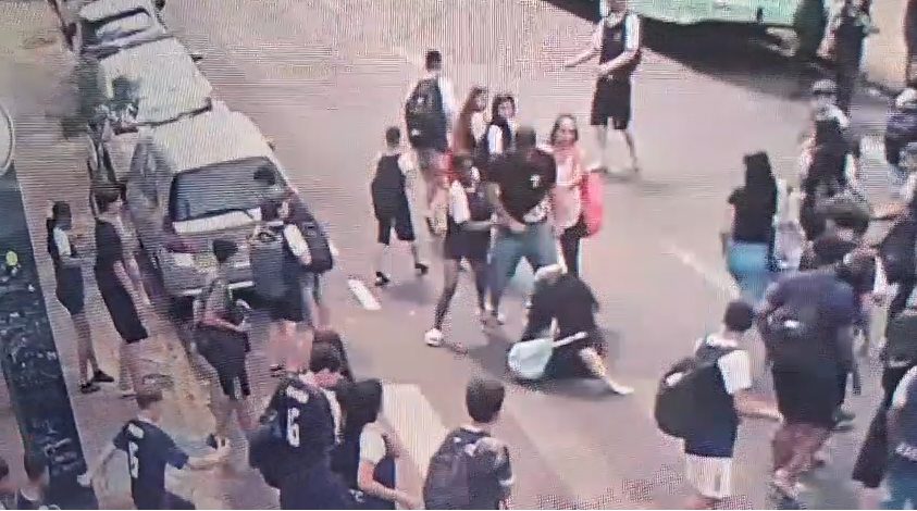 Câmeras de segurança mostram que a vítima atravessava a rua e, no sentido contrário, vinham o rapaz, de 19 anos, e sua irmã. Quando se cruzam, no meio da rua, ele desfere um soco violento e a adolescente cai.