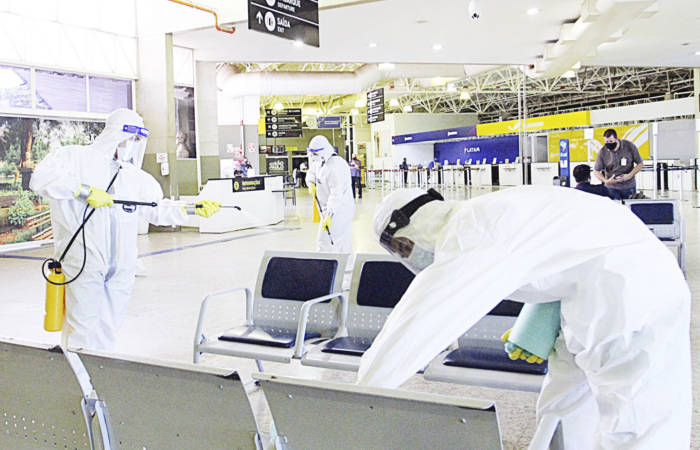 Eles utilizaram uma solução de hipoclorito de sódio para descontaminar áreas de grande circulação de pessoas, além de álcool 70% para higienizar superfícies, como corrimãos, cadeiras e balcões. A ação foi solicitada pela administração do aeroporto para controlar a disseminação da covid-19 no local.
