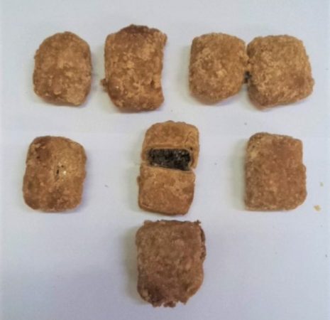 Ao submeter as paçocas a uma inspeção de rotina realizada pelo aparelho de raio-X, os agentes confirmaram a suspeita e encontraram oito porções de maconha. Estavam escondidas dentro das paçocas.