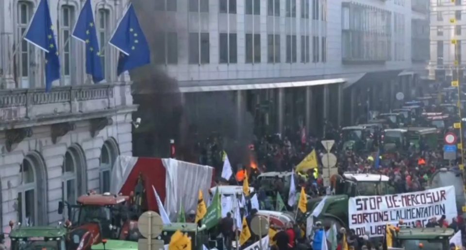 O movimento é uma nova demonstração de força dos protestos dos produtores rurais, que têm realizado manifestações nas últimas semanas contra as políticas agrárias da UE e a concorrência com produtos estrangeiros com custos mais baixos (reprodução/Redes Sociais)