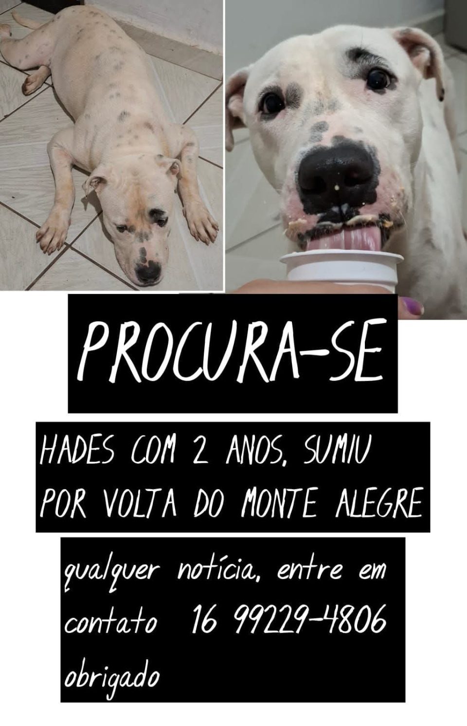 GeralAjudem encontrar meu pet 11 de abril de 2025 08:2510 de abril de 2025 18:31 Compartilhar0 Hades está com 2 anos e sumiu no bairro Monte Alegre. Informações (16) 99229-9806.