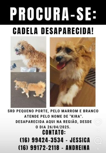 Kira é de pequeno porte, pelo marrom e branco. Está desaparecida desde o dia 26 de abril, no bairro Monte Alegre. Informações (16) 99424-3534 – Jéssica ou (16) 99172-2118 – Andreina.