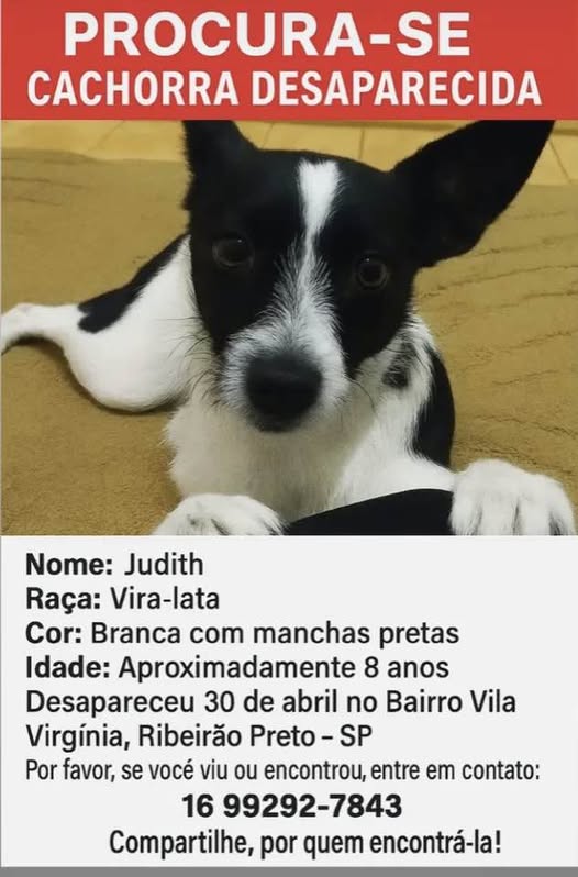 ‘Judith Raga’ tem cerca de oito anos e desapareceu no dia 30 de abril, no bairro Vila Virgínia, em Ribeirão Preto. Ela é SRD de cor branca com manchas pretas. Informações (16) 99292-7843.