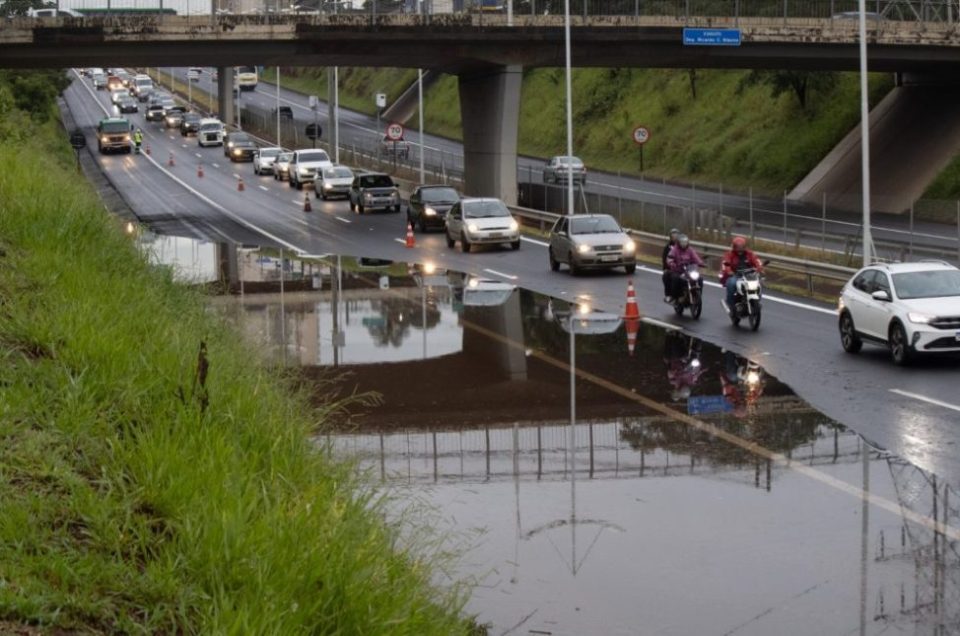 O trecho fica sob a rotatória da Avenida Leão XIII. A água, acumulada por conta das fortes chuvas que caíram no final da madrugada da terça-feira, invadiram o acostamento e a faixa da direita na pista expressa da avenida.