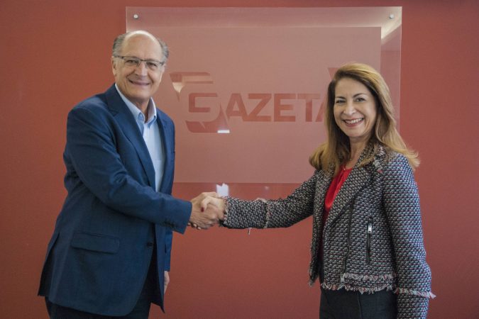 Geraldo Alckmin cumprimenta Marinês Rodrigues, superintendente de programação da TV Gazeta - Mariana Cavalcanti Divulgação