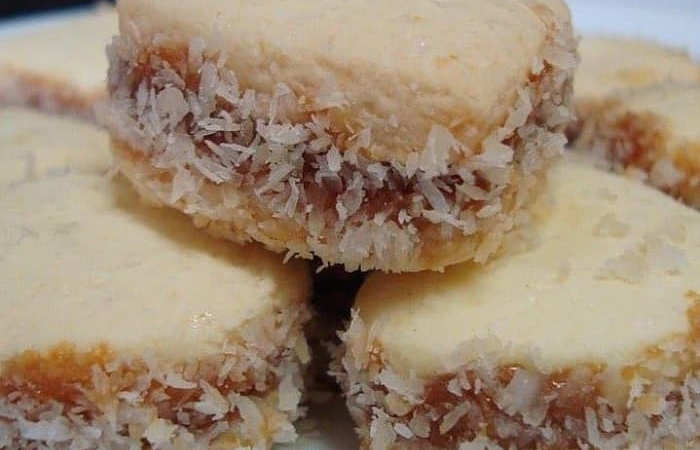 7. Depois de frios, retire da forma. Una dois biscoitos com doce de leite e passe coco ralado em volta.