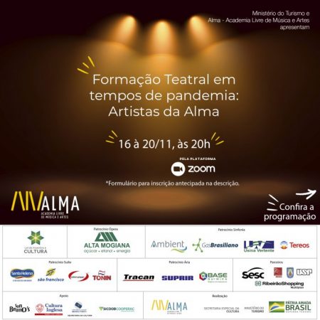 A Academia Livre de Música e Artes – Alma promove pela primeira vez um circuito online de formação teatral voltado para atores, estudantes de teatro e integrantes da área cultural. Serão cinco encontros com profissionais convidados, em aulas disponibilizadas por uma plataforma remota com um formulário disponível para realização da inscrição antecipada.