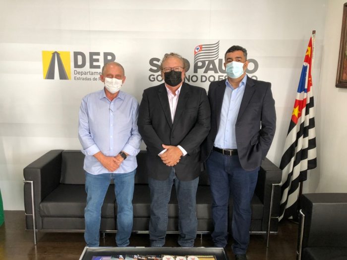Foto divulgação: Prefeito, José Roberto Marques (centro) e o secretário da Administração, Eduardo Poiares (dir.), com o superintendente do DER, Edson Caram