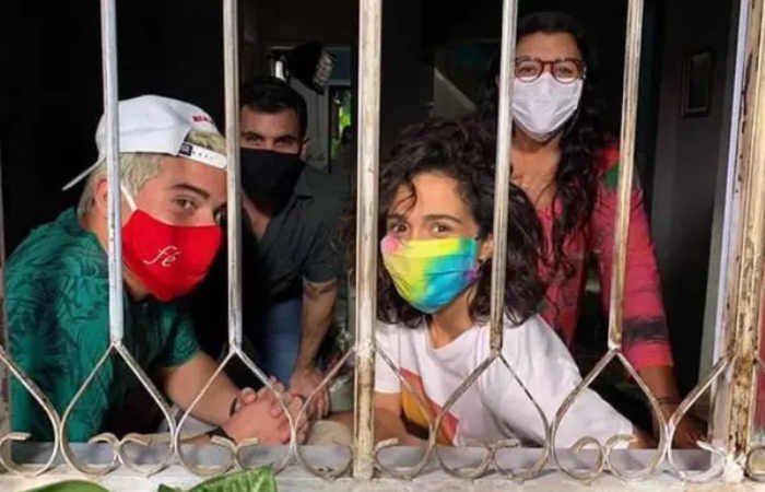 Nanda Costa compartilhou os bastidores das gravações da novela Amor de Mãe, onde ela e os atores Thiago Martins, Juliano Cazarré e Regina Casé aparecem juntos, usando máscaras, na quinta-feira, 27.