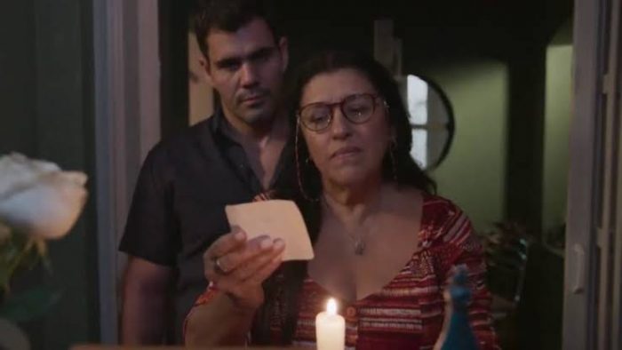Regina Casé aparece como Lurdes, acendendo uma vela e beijando uma foto de seu filho desaparecido: “24 anos procurando o meu filho”.