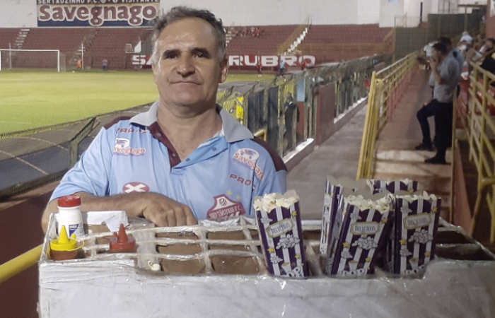 É da arquibancada que Maurício vende as pipocas e, simultaneamente, acompanha os jogos do Sertãozinho. “O time é uma bênção pra mim, eu gosto do Touro e quando tem jogo eu junto a paixão pelo time com a oportunidade de ganhar meu dinheiro e comprar ração”, conta.