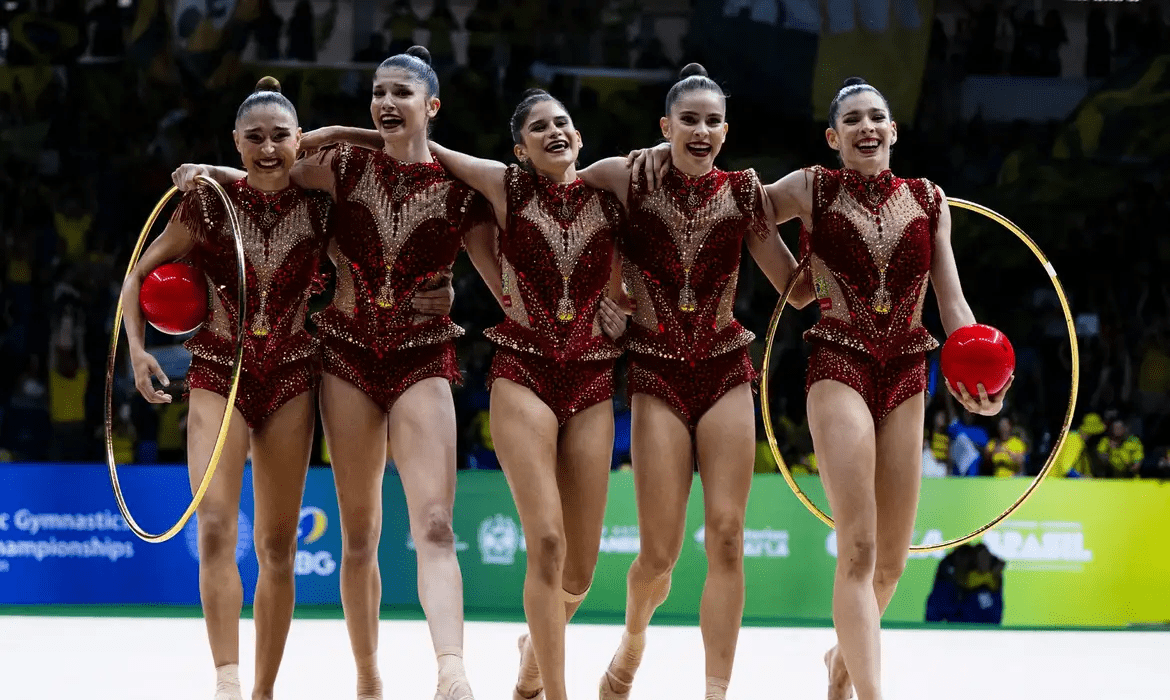 O conjunto brasileiro voltou a brilhar neste domingo (24) no Mundial de ginástica rítmica disputado na Arena Carioca 1 do Parque Olímpico, no Rio de Janeiro. Ao som de “Evidências”, Duda Arakaki, Nicole Pircio, Sofia Madeira, Mariana Gonçalves e Maria Paula Caminha fizeram uma grande apresentação na final da série mista (com três bolas e dois arcos) para somarem o total de 28.550 pontos e conquistarem a medalha de prata.