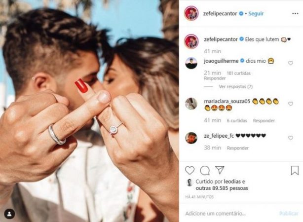 Zé Felipe está terminando o ano supercomprometido! O cantor, com apenas 21 anos, está noivo! Namorando com a bailarina do Faustão, Isabella Arantes desde março de 2019, Zé Felipe anunciou que vai se casar usando uma legenda inusitada: “Eles que lutem”. O filho de Leonardo explicou o momento emocionado: “Estou feliz. Hoje é difícil arrumar mulher boa, e quando arruma, tem que namorar. Conheci no Instagram, quando estava em Aparecida do Norte [interior de São Paulo], e começamos a conversar”, explicou.