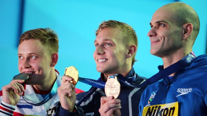“Foi um pouquinho distan­te do que eu tinha planejado, com 22s40. Mais uma vez acho que, na saída, o árbitro segu­rou bastante, isso atrapalha nas provas de velocidade. Mas, estou satisfeito, praticamente não estaria aqui não fosse o convite da Fina. Estou muito feliz, mais uma medalha em Mundial, a primeira do Brasil nesse Mundial. Estou muito satisfeito, com 39 anos, fazen­do história na natação”, disse Nicholas Santos.