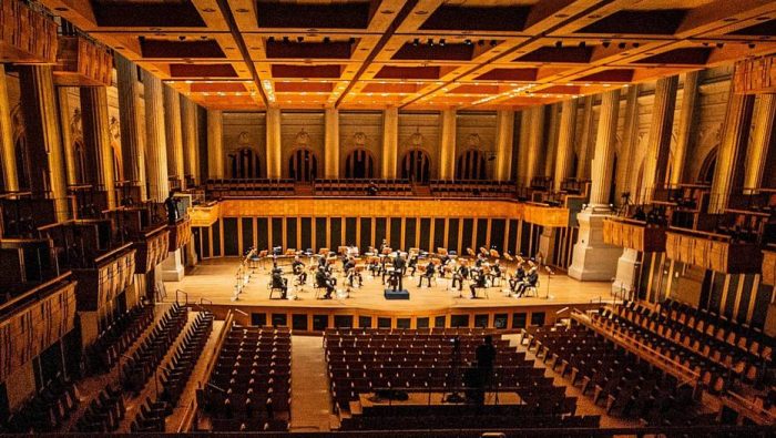 Enquanto as câmeras ainda eram posicionadas para transmitir pela internet a apresentação, técnicos se certificavam de que a distância entre as cadeiras estava correta; e, no pé de cada uma delas, um recipiente já esperava pelos respingos de condensação e saliva que poderiam cair dos instrumentos, evitando o contato com o palco, arriscando contaminação pelo coronavírus.