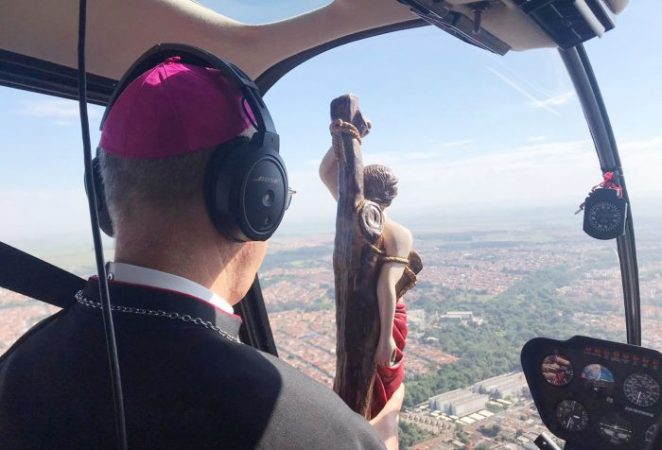 O arcebispo da Arquidiocese de Ribeirão Preto (SP), dom Moacir Silva, sobrevoou a cidade de helicóptero neste domingo (12) de Páscoa para abençoar os municípios da região. O religioso carregou as imagens de São Sebastião, padroeiro da arquidiocese e santo protetor contra a fome, peste e guerra, e da Nossa Senhora Aparecida, Padroeira do Brasil.