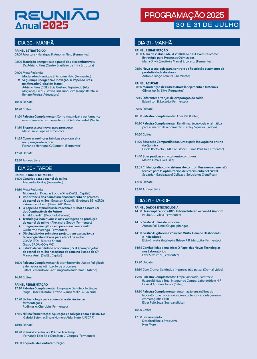 A Reunião Anual da Fermentec, recebe profissionais do setor do Brasil e do exterior pela segunda vez no Multiplan Hall, em Ribeirão Preto. Os temas discutidos refletem os desafios reais do mercado, com soluções baseadas em técnica, ciência e dados. O evento reunirá especialistas que são referência em ciência, inovação e aplicação prática no setor sucroenergético. A proposta é criar um ambiente para ouvir, compartilhar e alinhar estratégias que impactam diretamente os resultados da safra e da operação industrial.