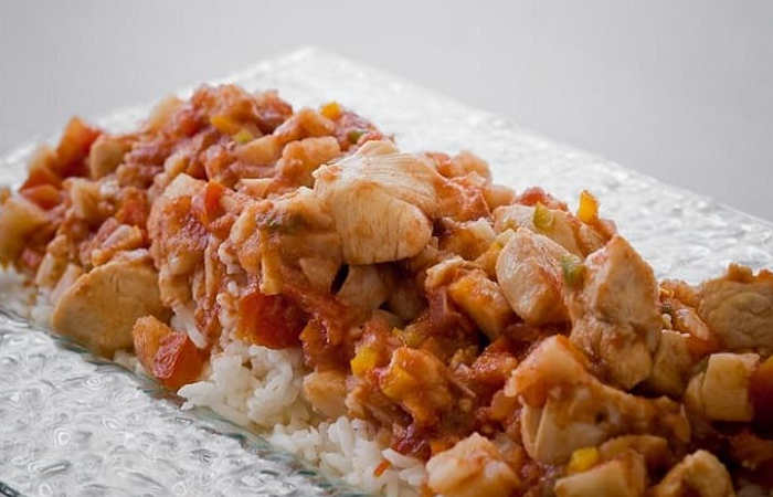 1. Na panela de pressão, frite a cebola e o peito de frango.