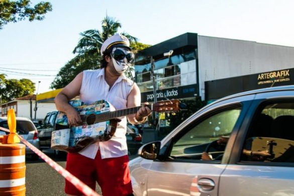 Ricotta – Arte nesse momento é serviço essencial. Tá todo mundo tão triste e deprimido dentro dos seus carros, nos ônibus, os pedestres… Aí vejo que a pessoa está ali, de cara emburrada. De repente do nada, ela vê um mascarado dançando e tocando violão, fazendo show num lugar inacreditável e abre um sorriso, sabe? Às vezes basta pra salvar o dia de alguém. Essa virou a intenção maior do projeto nesse momento de ‘luto’ coletivo. Não é mais só chamar atenção pra música, literatura e pra arte visual abstrata que crio. E claro, o fato de me apresentar sempre próximo de áreas verdes da cidade é um gatilho pra estimular o debate ecológico. Precisamos conscientizar as pessoas de que o surgimento do vírus é uma resposta de um planeta maltratado e sobrecarregado pra nós e que devemos repensar nossa relação com a natureza. Esquecemos de que o planeta é uma entidade viva. Ele criou o vírus. Não é culpa da China; a culpa é de nós mesmos.