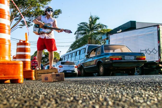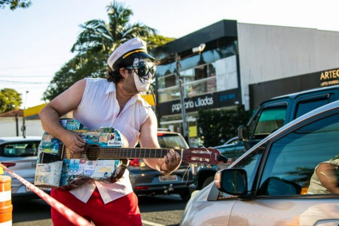 Ricotta – Arte nesse momento é serviço essencial. Tá todo mundo tão triste e deprimido dentro dos seus carros, nos ônibus, os pedestres… Aí vejo que a pessoa está ali, de cara emburrada. De repente do nada, ela vê um mascarado dançando e tocando violão, fazendo show num lugar inacreditável e abre um sorriso, sabe? Às vezes basta pra salvar o dia de alguém. Essa virou a intenção maior do projeto nesse momento de ‘luto’ coletivo. Não é mais só chamar atenção pra música, literatura e pra arte visual abstrata que crio. E claro, o fato de me apresentar sempre próximo de áreas verdes da cidade é um gatilho pra estimular o debate ecológico. Precisamos conscientizar as pessoas de que o surgimento do vírus é uma resposta de um planeta maltratado e sobrecarregado pra nós e que devemos repensar nossa relação com a natureza. Esquecemos de que o planeta é uma entidade viva. Ele criou o vírus. Não é culpa da China; a culpa é de nós mesmos.