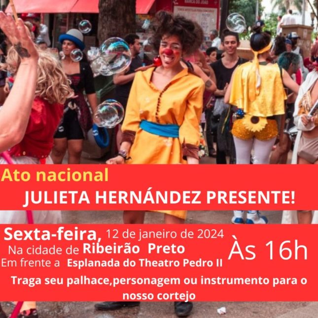 Artistas de Ribeirão Preto realizam na próxima sexta-feira, dia 12, um cortejo artístico, a partir das 16 horas, com concentração em frente ao Theatro Pedro II, em homenagem à artista circense e cicloativista Julieta Hernández, conhecida como “Miss Jujuba”. Estão previstas várias manifestações culturais, como apresentações de bonecos, palhaçarias, exibição de uma canção escrita especialmente sua homenagem.