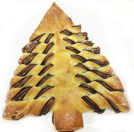 ◆ Em seguida, sobre este triângulo de massa passe um terço de xícara de chá de creme de avelã com uma espátula formando o desenho de uma árvore com um pedacinho de tronco no meio do triângulo ficando uma borda de cerca de 3 centímetros sem recheio.