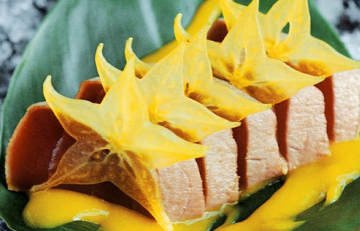 8. Distribua o molho de manga no prato e disponha no centro as fatias de atum intercaladas com as de carambola.