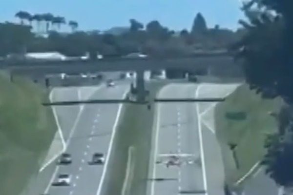 Em vídeo publicado nas redes sociais, é possível ver a aeronave pousando na rodovia. Ela bate em uma placa de sinalização, mas não atinge nenhum veículo.