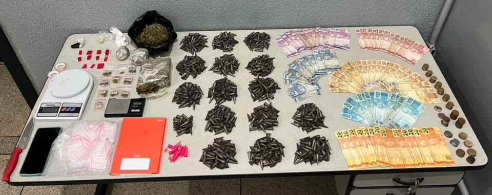 Foram apreendidos dois tijolos e porções de maconha, que totalizaram mais de meio quilo, além de 773 microtubos com cocaína, somando quase 900 gramas. Também foram recolhidas duas balanças de precisão, além de R$ 2.410 em dinheiro e um caderno com anotações relacionadas ao tráfico.