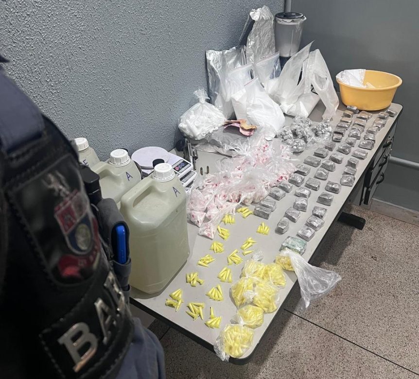 Os PMs foram até a casa e localizaram grande quantidade de drogas e insumos para o refino e fracionamento. Além da moto e do revólver, os agentes apreenderam 1.018 cápsulas com cocaína, 47 grandes porções de maconha, 168 porções unitárias de maconha, 3 balanças de precisão, 7 sacos contendo pó branco semelhante a cocaína, R$ 50 em dinheiro e 3 galões de éter e acetona.