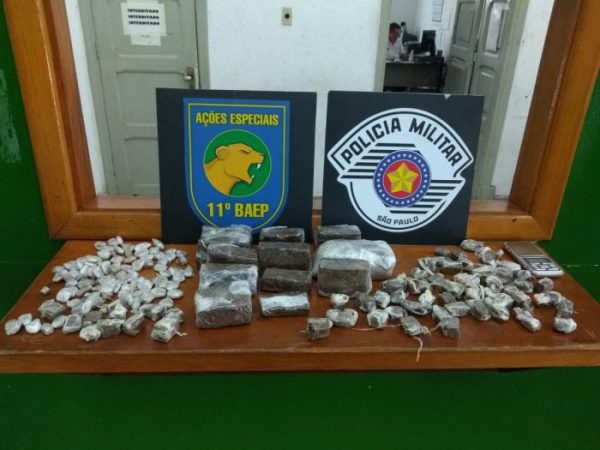 Além disso, em vistoria de um terreno ao lado da viela, foi encontrada uma sacola com várias porções de maconha, já preparadas para comercialização, e uma balança de precisão.
