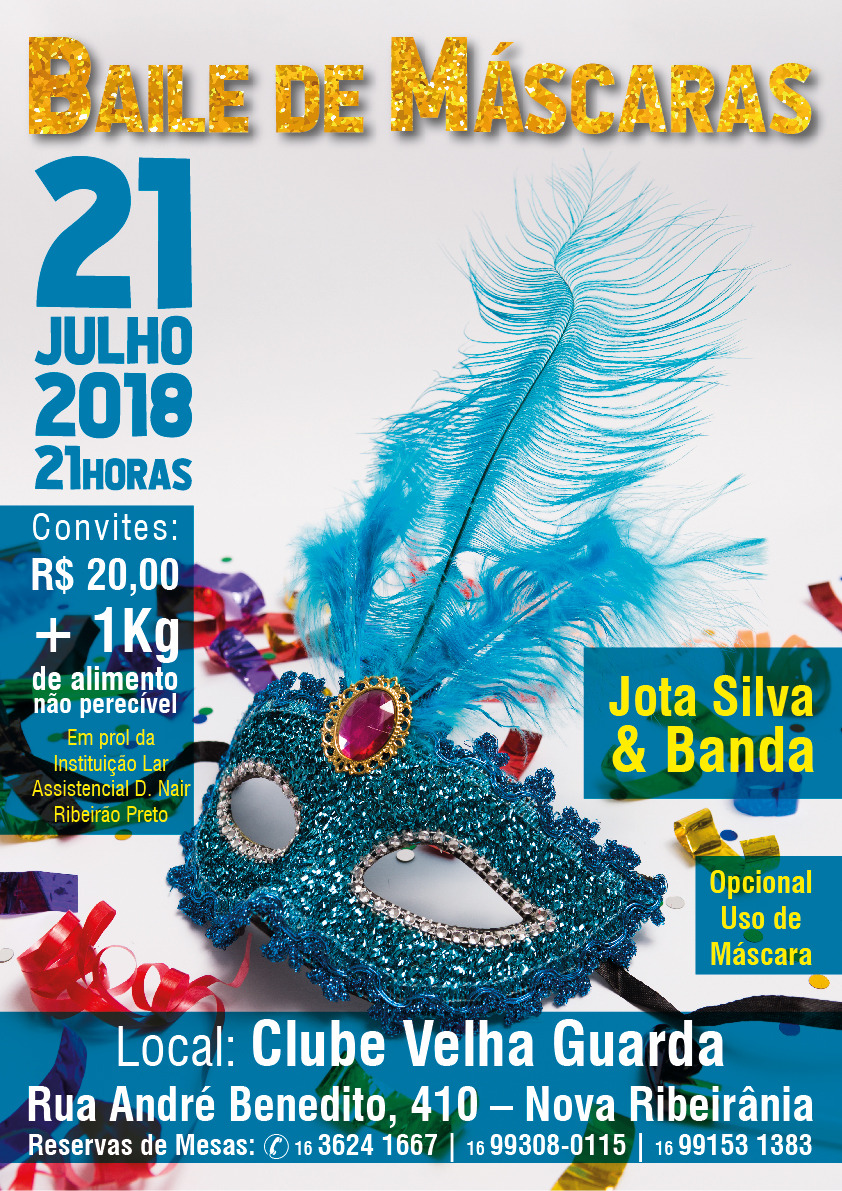 O Clube Velha Guarda promove no próximo dia 21, a partir das 21 horas, um Baile de Máscaras, em prol da Instituição Lar Assistencial D. Nair de Ribeirão Preto. O baile conta com a apresentação de Jota Silva e Banda e o convite custa R$ 20 mais 1 Kg de alimento não perecível. O Clube Velha Guarda fica na Rua André Benedito, 410, no bairro Nova Ribeirânia e as reservas de mesas devem ser feitas pelos telefones (16) 3624-1667 ou 99308-0115.