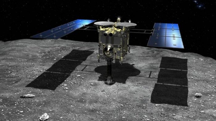 A sonda chegou a Ryugu em 2018, primeiro para digitalizá-lo enquanto orbitava o asteroide e implantar vários veículos móveis em solo. Assim, os cientistas descobriram que Ryugu é uma pilha de entulho muito porosa, com cerca de 50% de espaço vazio.