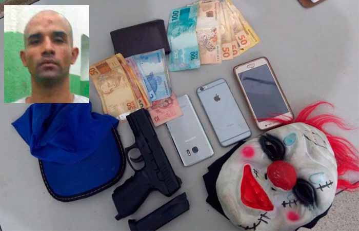 Ele ainda tentou se desfazer de uma arma de brinquedo – simulacro de uma pistola .40 -, dois celulares, carteiras de documentos das vítimas e uma máscara de palhaço com o próprio nome grafado.