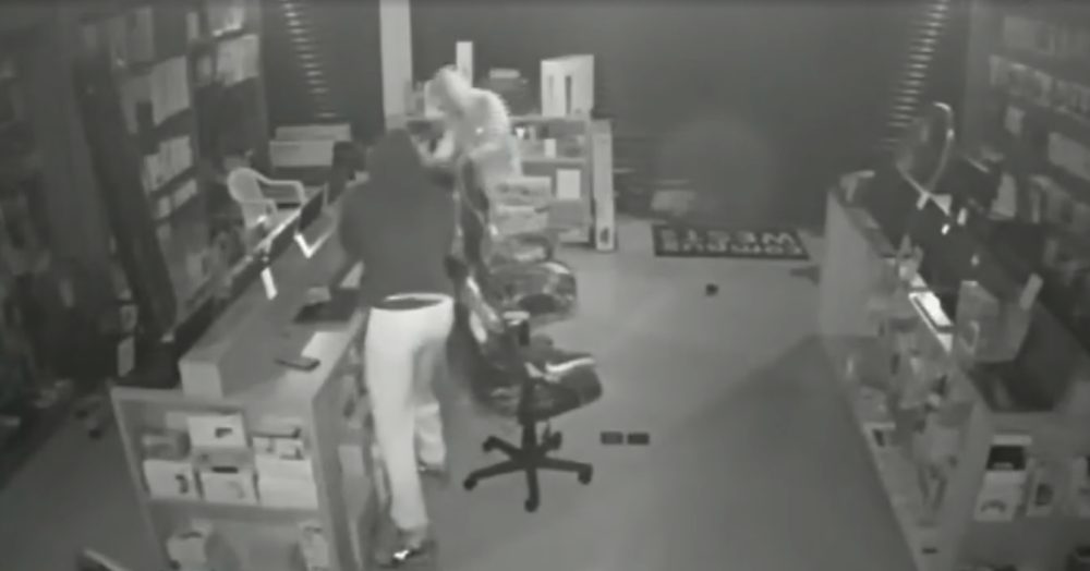 O trio chegou em um Fiat Uno e estacionou o carro sobre a calçada. Era por volta de 03h50. Imediatamente eles quebram o portão da loja. Em seguida, quebram uma porta de vidro e danificam uma porta de aço, até terem acesso à loja.