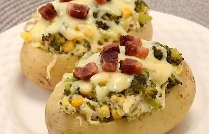 5. Para o recheio, misture todos os ingredientes em uma tigela e divida entre as batatas.