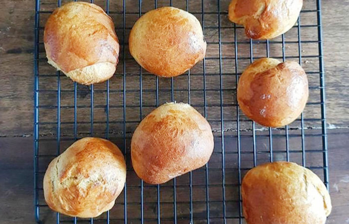 Na batedeira coloque a farinha, o fermento seco e o açúcar. Acrescente a bebida vegetal e bata por 4 minutos em velocidade baixa e depois por 8 minutos em velocidade média. Acrescente o sal e o óleo de coco e bata 4 mi­nutos na velocidade alta. Faça uma bola com a massa e deixe descansar em um bowl untado com óleo de coco. Cubra com plástico filme e faça furinhos no plástico. Deixe por 1 hora. Ao final desde tempo, enfarinhe a bancada e divida a massa em 14 porções iguais. Cubra com pano e deixe descansar por 15 minutos. Faça bolinhas com as mãos e já coloque em uma assadeira enfarinhada, deixe espaço entre eles. Pincele por cima melado de cana mis­turado com óleo de coco. Deixe descansar novamente por 1 hora. Asse em forno pré-aquecido a 180c por 20 minutos. Retire do forno, coloque em uma grade, espere esfriar.