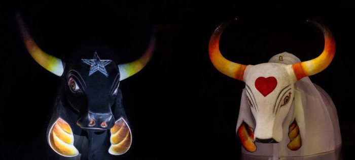 No Bumbódromo, os bois Caprichoso (preto com a estrela azul) e Garantido (branco com coração vermelho) se “enfren­tam” com apresentações durante três noites, numa sequência de músicas, coreografias e cenários distintos. Andrea Goldschmidt já registrou 38 festas populares e manifestações culturais e religio­sas, em 13 estados diferentes.