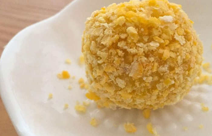 3. Coloque os flocos numa tigela. Mergulhe as bolinhas na água e depois passe nos flocos até ficarem bem cobertas.