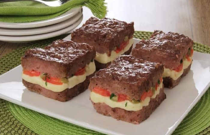 3. Sobre a carne, faça uma camada com a mussarela, o tomate e a azeitona.
